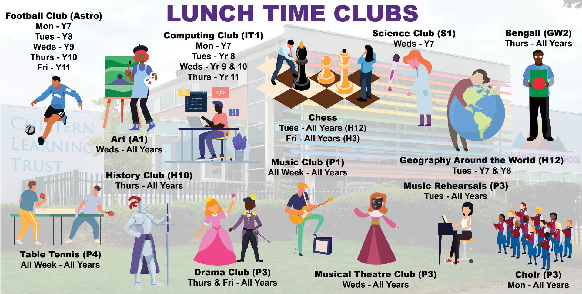 Lunch Time Clubs are open to all pupils and take place 1:20pm-2:00pm. Pupils are encouraged to bring a packed lunch to the club, or eat hot food before attending.
