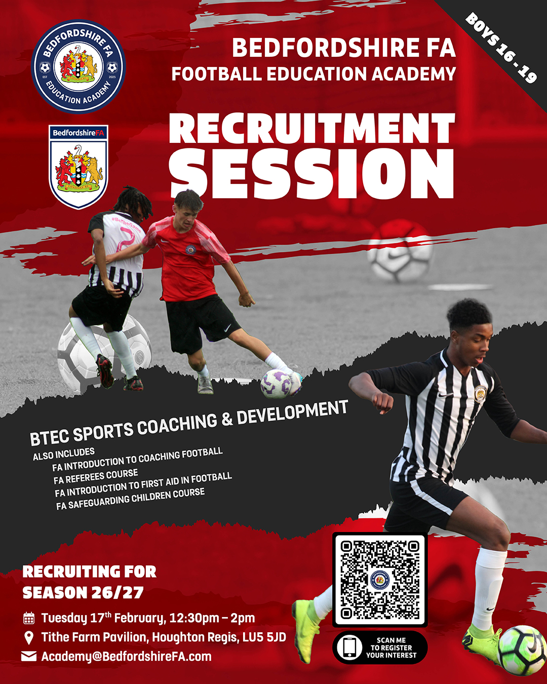 The Bedfordshire FA Football Education Academy is for aspiring 16 -19 year olds.