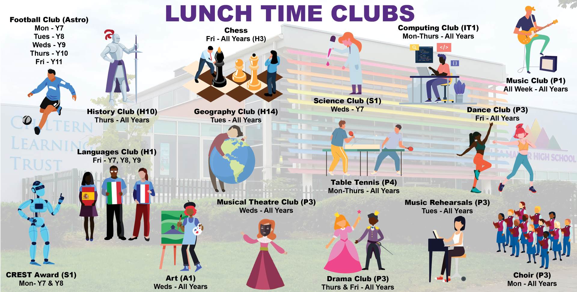 Lunch Time Clubs are open to all pupils and take place 1:20pm-2:00pm. Pupils are encouraged to bring a packed lunch to the club, or eat hot food before attending.